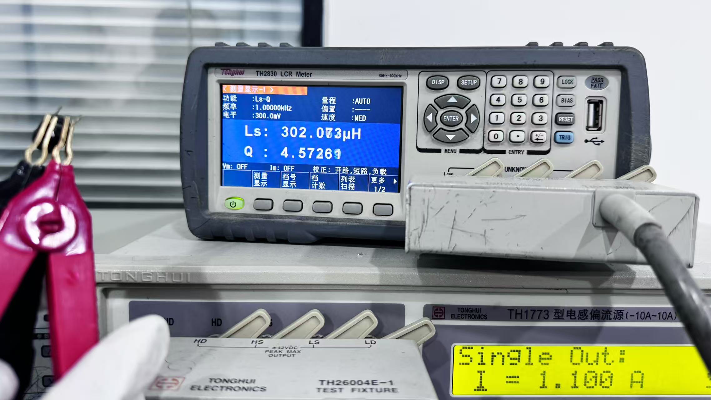在樣品交付前,谷景已對該電感進行了全面性能檢測:阻值穩定在 0.398-0.405Ω 之間,感值控制在 300.6-306.7uH 范圍,完全符合 ±10% 的誤差要求;電流承載性能上,1.1A 電流下感值變化率僅 11.5%,1A 電流下溫升 32.2℃且感值變化率 9.5%,各項指標均滿足客戶 0.7A 的電流使用需求。此外,電感采用長腳設計,0.65mm 的引腳直徑與 5mm 的腳距,也完美匹配客戶電路板的安裝規格。